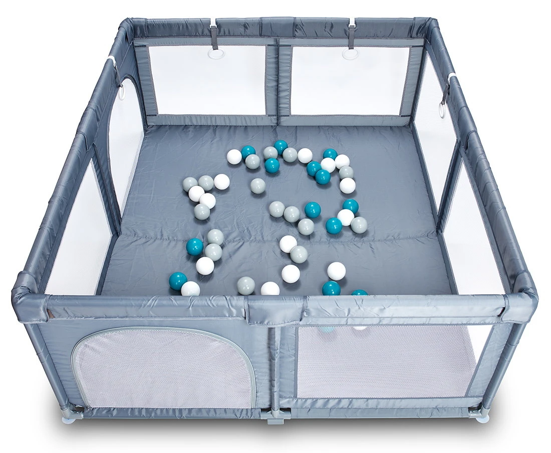De ballenbak heeft mesh-stof zijkanten, zodat je je kindje altijd goed in de gaten kan houden. Hij is 150 bij 180 cm groot, genoeg speelruimte dus! De 48 meegeleverde gekleurde ballen maken het helemaal af. Uiteraard ook zonder ballen te gebruiken, zo creëer je een veilig plekje om te spelen of te liggen.