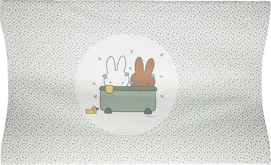 Op dit comfortabele aankleedkussen van Bebe-Jou heb je je kindje in een handomdraai gewassen en aangekleed! Hij heeft een groene allover stipjes print met centraal een schattige afbeelding van Nijntje en Nina. Door de waterafstotende laag is het kussen gemakkelijk schoon en droog te maken, handig bij het wassen of in geval van een ongelukje!