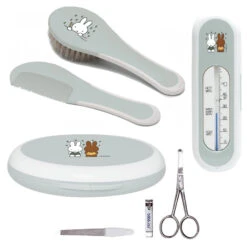 De kapset bestaande uit een kam en zachte borstel met een comfortabele grip. Het manicuresetje in een bewaardoosje bevat een RVS schaartje met afgeronde uiteinden, een nagelknipper en een vijltje. De badthermometer geeft de temperatuur nauwkeurig weer en bevat een indicator voor de ideale watertemperatuur.