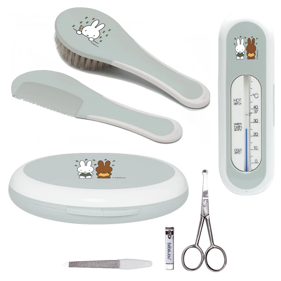 Met deze handige verzorgingsset van Bebe-Jou heb je een goede basis in huis voor de verzorging van je kleintje. Koop hem als startpakket voor je kindje of doe hem kado aan nieuwe ouders! De set bestaat uit een kapset, een manicureset en een badthermometer. Hij wordt geleverd in een mooi geschenkdoosje. De geschenkset is zacht groen en bedrukt met schattige afbeeldingen van Nijntje en Nina.