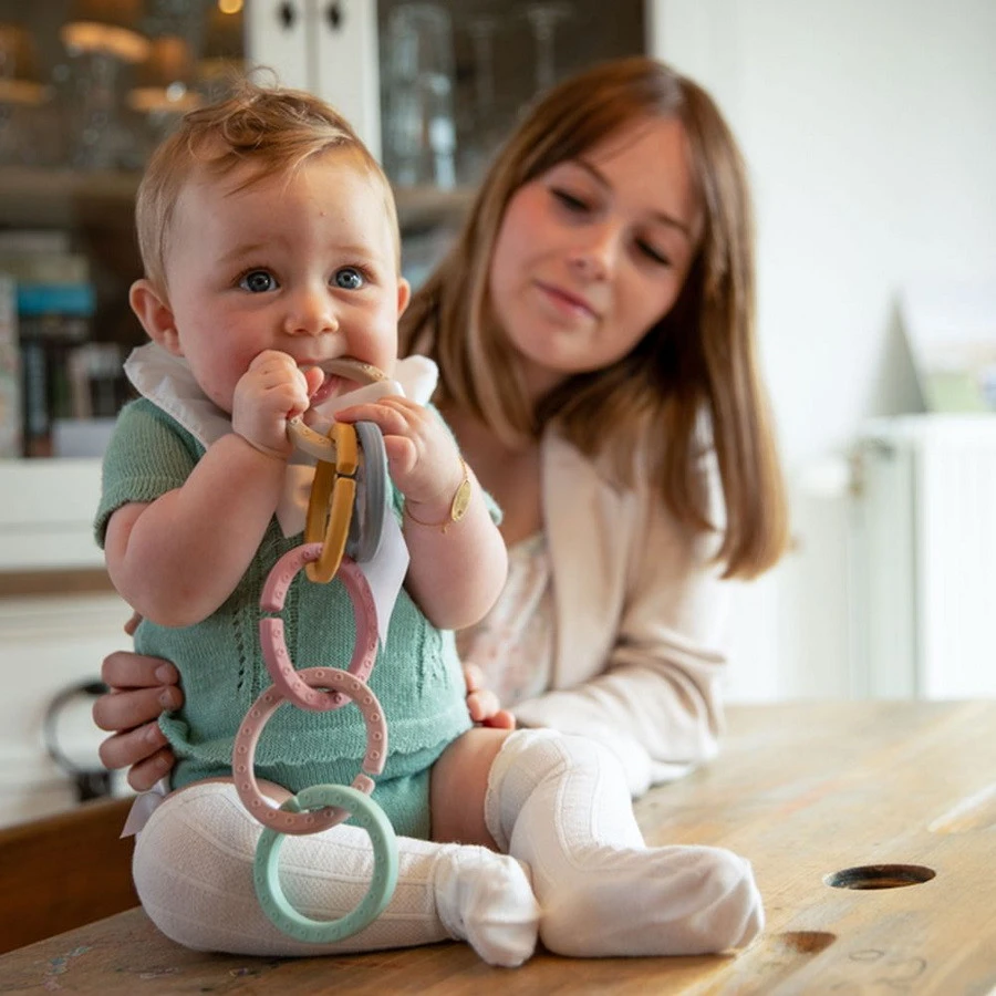 Raakt jouw kindje niet uitgekauwd op alles wat hij of zij in de handjes krijgt? Probeer dan eens deze siliconen ringen! Ze hebben een fijne bolletjesstructuur die het tandvlees masseert. Ze zijn niet alleen lekker om op te kauwen, maar ook leuk om mee te spelen. Zo kan je kleintje de fijne motoriek onder de knie krijgen door de ringen van elkaar te halen en weer aan elkaar te maken.