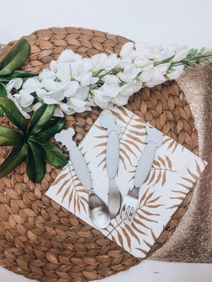 Het bestek heeft een siliconen handgreep in combinatie met roestvrij staal. De schattige dierenfiguurtjes (koala, leeuw en olifant) maakt het zelfstandig leren eten meteen stuk leuker! Smakelijk eten!