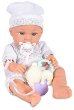 Daarnaast wordt er een speen inclusief speenketting meegeleverd, een flesje, rammelaar én een wit dekentje. Genoeg attributen om urenlang speelplezier van te hebben! Zo kun je haar een slaapje laten doen en lekker inwikkelen in de deken.