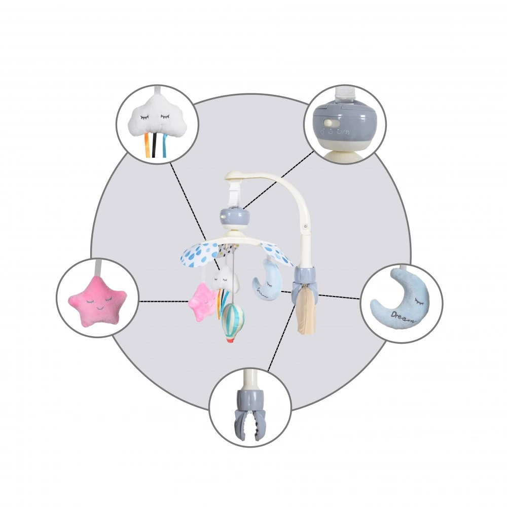 Dankzij een klem bevestig je hem gemakkelijk aan het bedje of de box. Hij is voorzien van een handig paneeltje waarmee je hem kan bedienen. Zo kun je zelf kiezen voor een volgend melodietje, geluidje of om de figuurtjes laten draaien. Hij wordt geleverd exclusief 2x AAA batterijen.