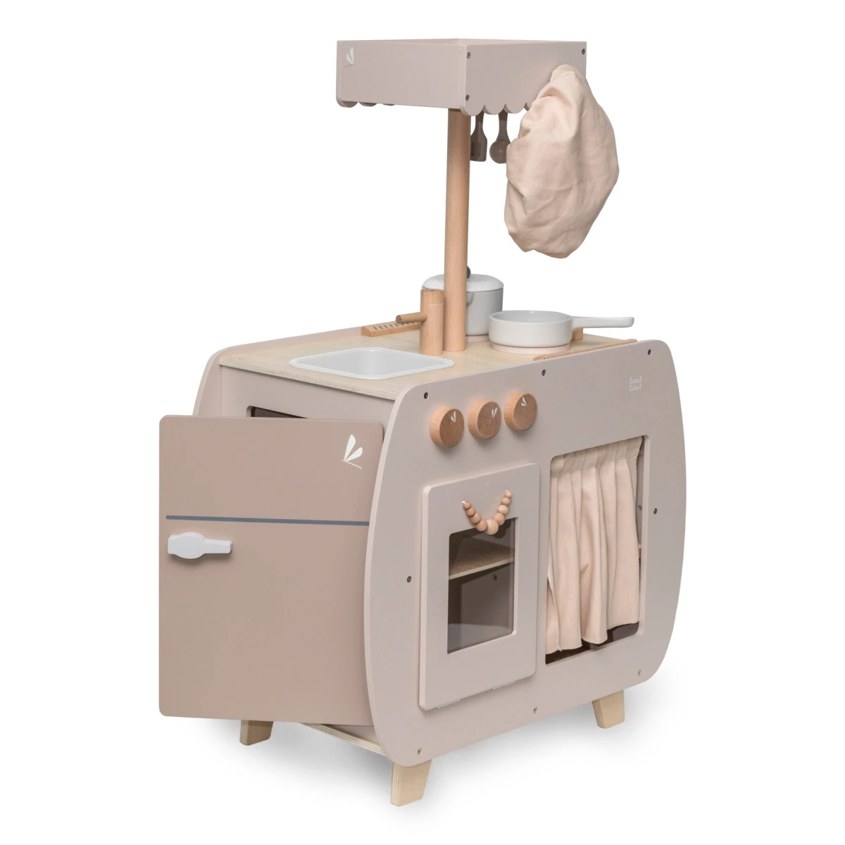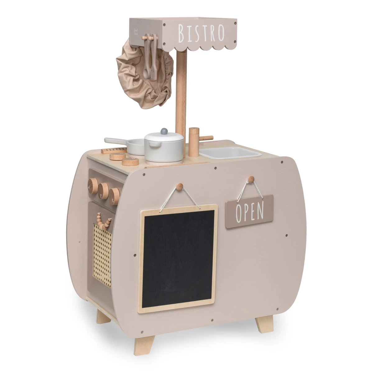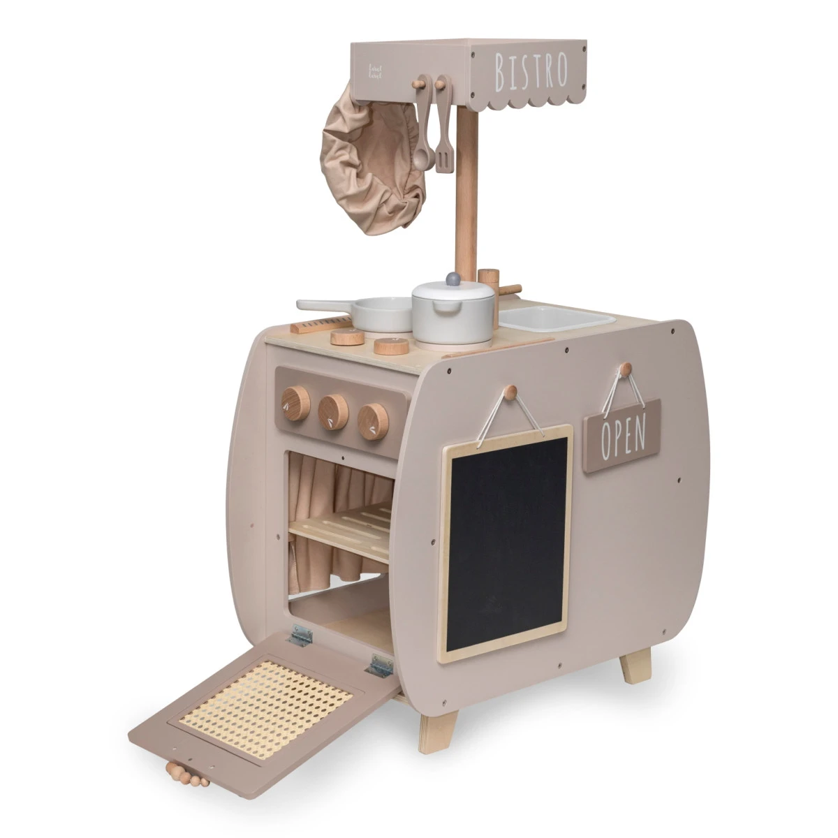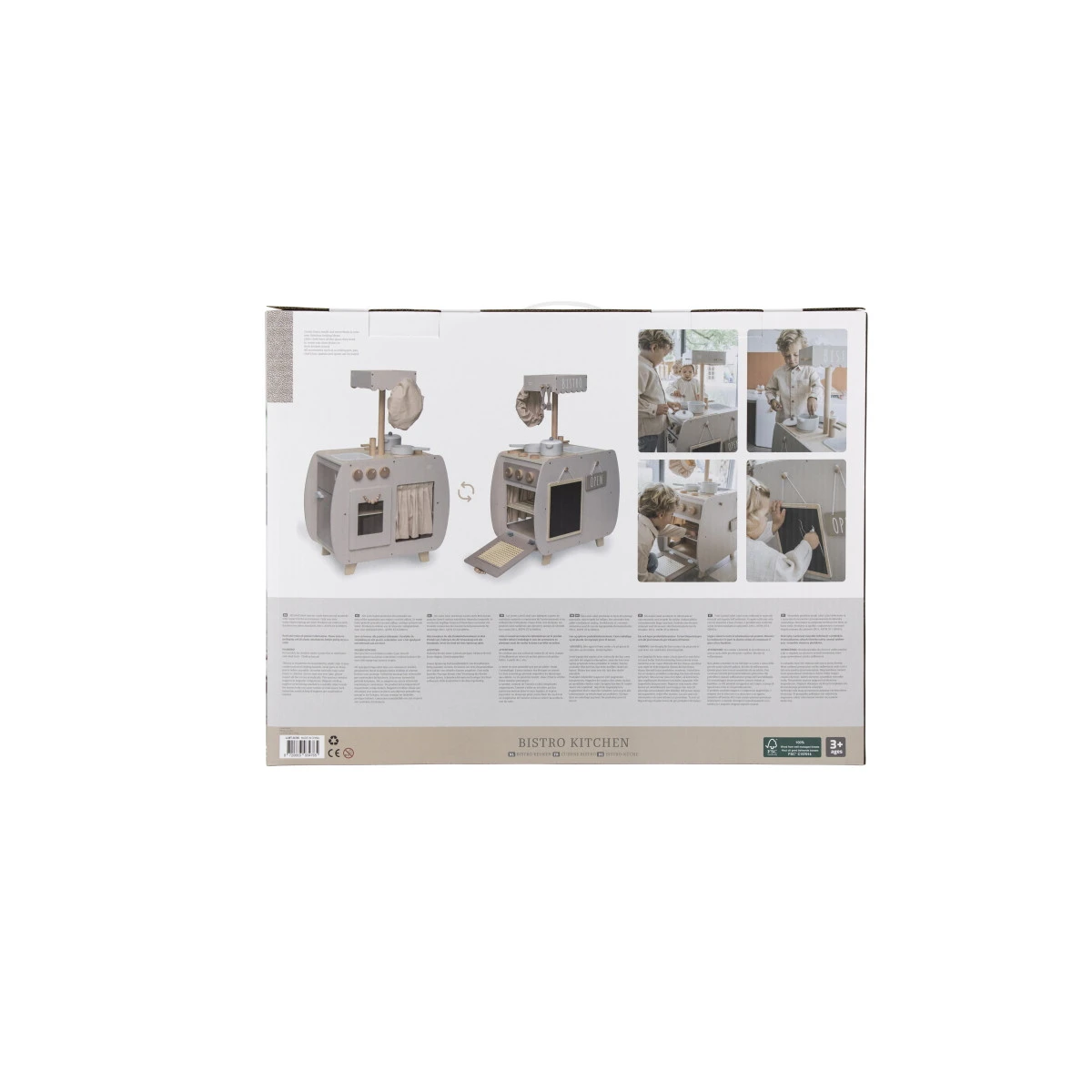 Doordat het kookeiland is voorzien van verschillende schattige details zoals de knoppen van het gasfornuis en de leuke handvaten, lijkt het net een echte grote mensen keuken. Daarnaast kunnen ook alle deurtjes geopend worden. Omdat je kindje rond om de keuken kan lopen, kan hij of zij ook samen met een vriendje of vriendinnetje de sterren van de hemel koken. De keuken heeft aan alle kanten wat te beleven en heeft de afmetingen 60 x 34,5 x 51/89 cm. De totale hoogte van de keuken is 89 cm, de hoogte van het werkblad is 51 cm hoog. Het bistro keukentje is geschikt voor kinderen vanaf 3 jaar.Â