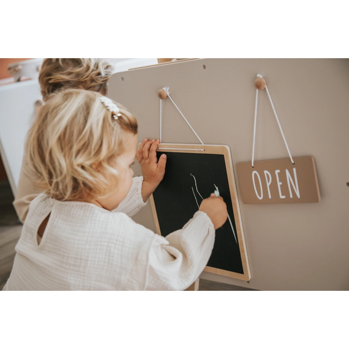 Bij een echt restaurant kun je natuurlijk ook niet zomaar binnenlopen en hopen dat de kok aanwezig is, hiervoor heb je een geopend bordje nodig. Ook de menukaart mag niet ontbreken, met het handige krijtbord inclusief krijtjes kan jouw kindje iedere dag een ander menu bedenken en op de kaart zetten. Superhandig, zo weet jij wat je op je bord krijgt als je bij de kleine chef-kok gaat eten.Â