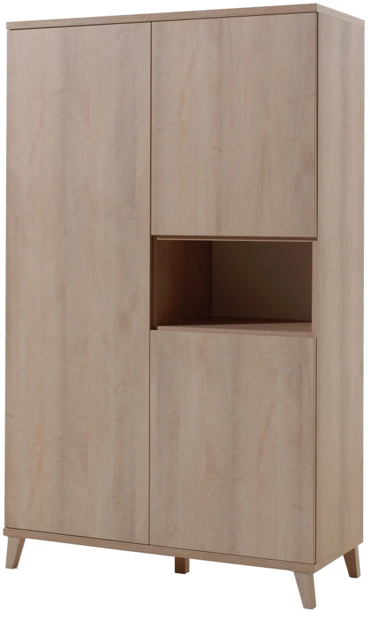 De stijlvolle kast heeft een mooie eikenhout look en biedt voldoende ruimte om de kleertjes van je kindje in op te bergen. Hij heeft één grote deur links met een groot hanggedeelte. Rechts heeft de kast twee deurtjes met legplanken en in het midden een apart opbergvak.