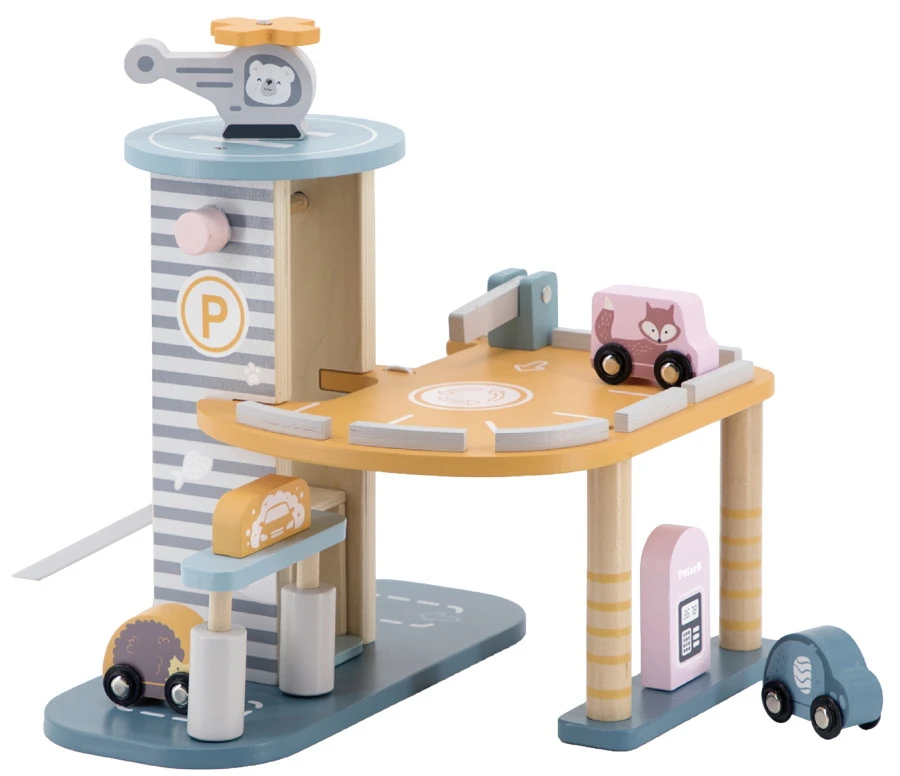 Wat zal je kindje eindeloos spelen met deze toffe Houten Parkeergarage van PolarB! De garage is gemaakt van stevig hout en is voorzien van verschillende accessoires die zorgen voor veel speelplezier. Zo heeft de garage bijvoorbeeld een slagboom, een lift en wordt hij geleverd met drie leuke dierenauto’s en een helikopter.Â