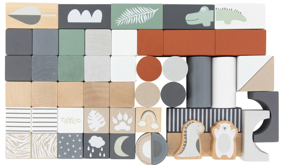 Deze blokkenset bestaat uit 50 stuks blokken. De blokjes zijn gemaakt van degelijk hout en hebben verschillende vormen, kleuren én printjes! Zo zullen de o.a. de dinosaurus, krokodil en ijsbeer het kindje vergezellen tijdens het bouwen.
