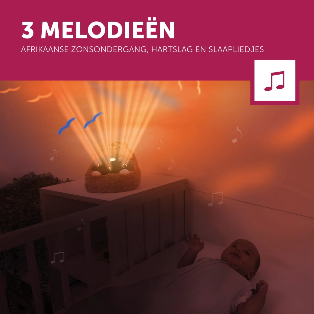 Met de Henry de Egel projector van Zazu verander je jouw kleintje zijn of haar kamer in een magische Afrikaanse zonsondergang. Vliegende vogels en de ondergaande zon worden geprojecteerd in de kamer en zorgen, samen met de Afrikaanse geluiden, voor een kalmerende sfeer in de kamer zodat je kleintje heerlijk in slaap kan vallen.