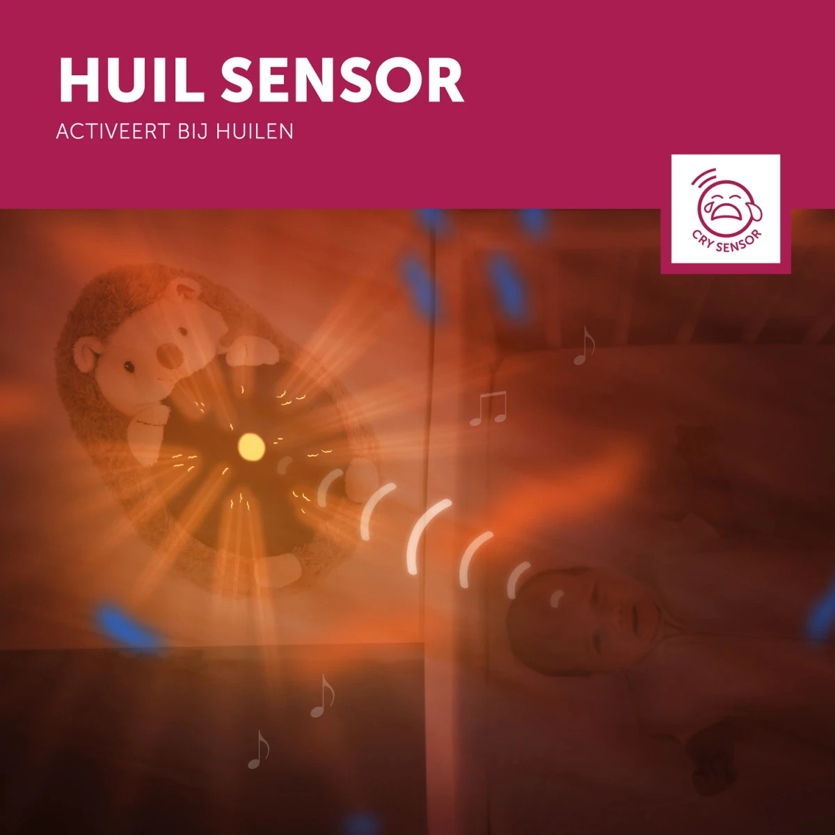 Je hebt de keuze uit drie soorten geluiden tijdens het in slaap vallen: Afrikaanse geluiden, hartslag of slaapliedjes (drie melodietjes). Ook kun je 2 volumeniveaus kiezen: hard of zacht. Begint je kindje te huilen? Henry de Egel heeft een huilsensor en zal dan automatisch aan gaan (optioneel). De projector werkt op 3-AA batterijen, deze zijn niet inbegrepen.